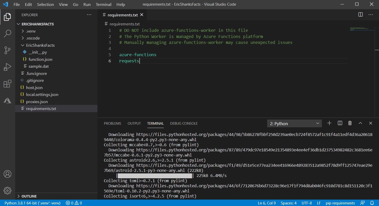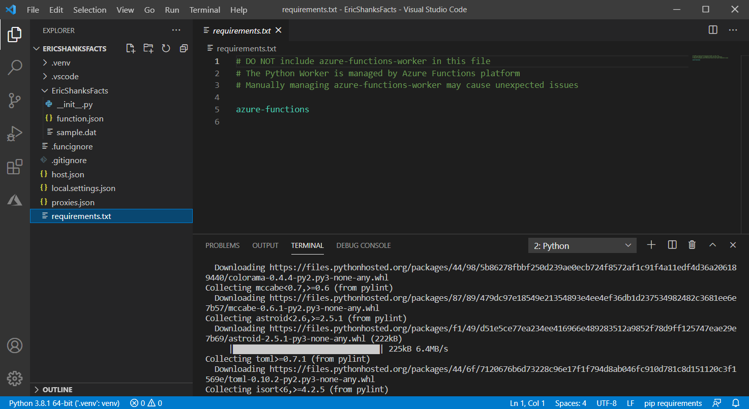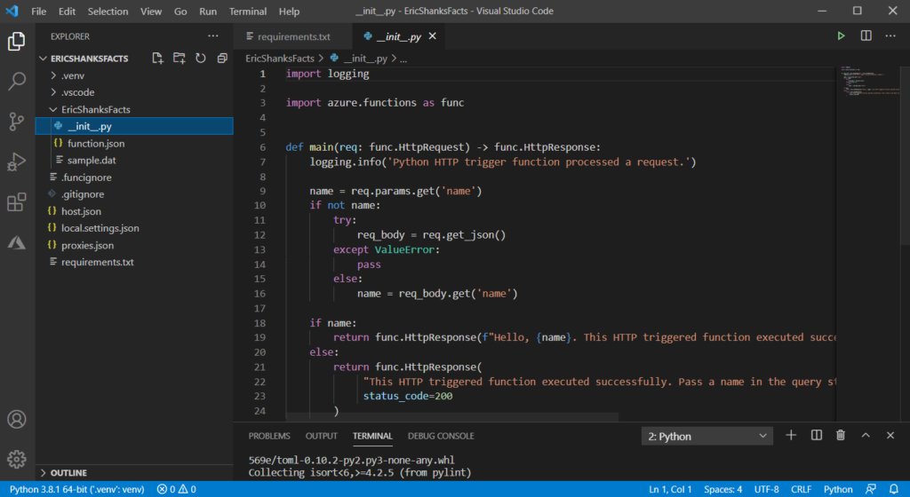 A neat thing about Code is that for almost anything you’d want to do, there’s an extension that can help you do that easier. To build and publish our function, we need two of them: the Python extension and the Azure Functions extension.