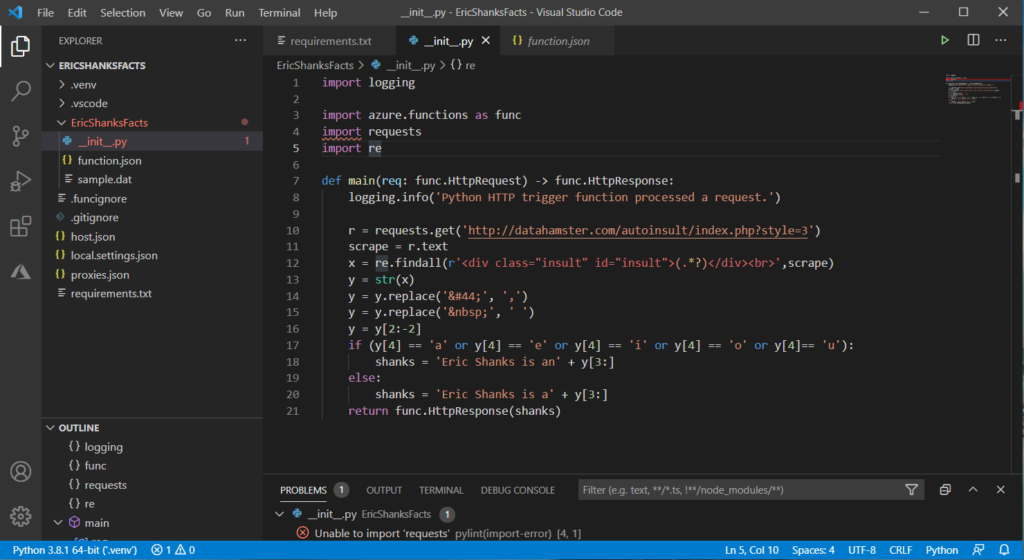 You may or may not get that Unable to import requests error pylint error. We’ll fix that in a minute, first I want to describe what the code is doing.
