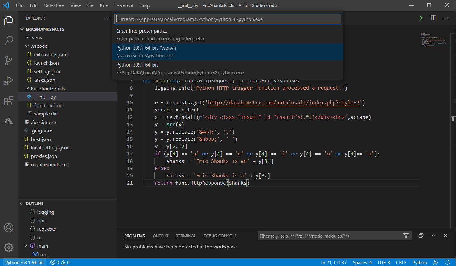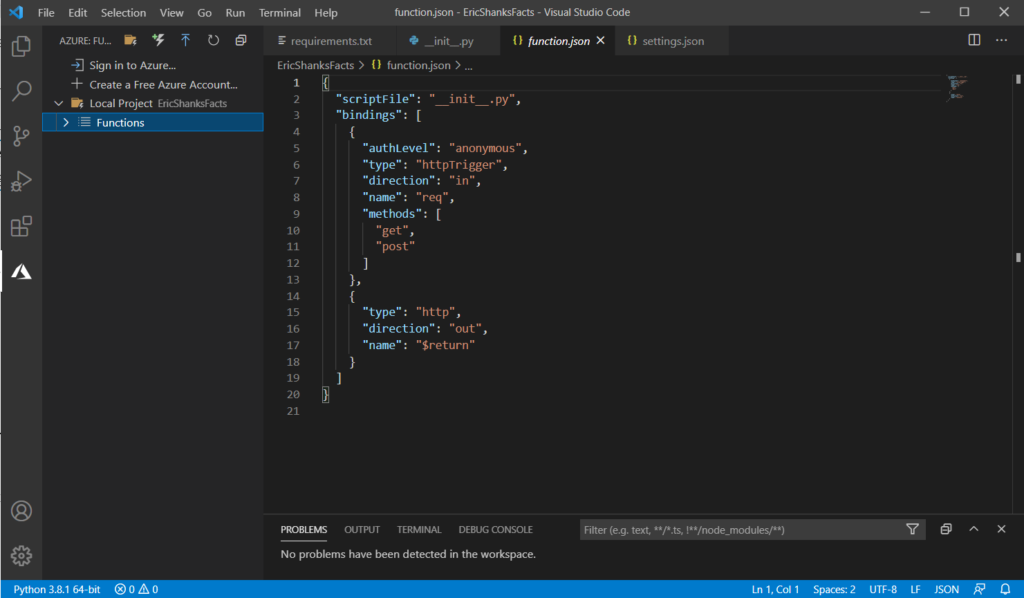 - Python. 3.8, 3.7, and 3.6 are supported by Azure Functions. Here’s the link to 3.8.
