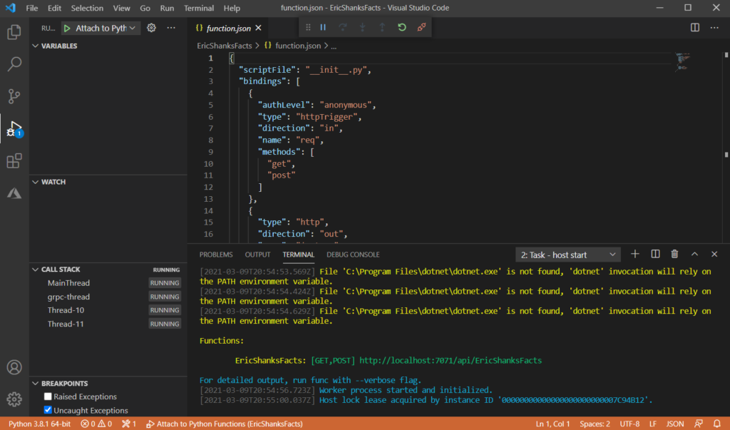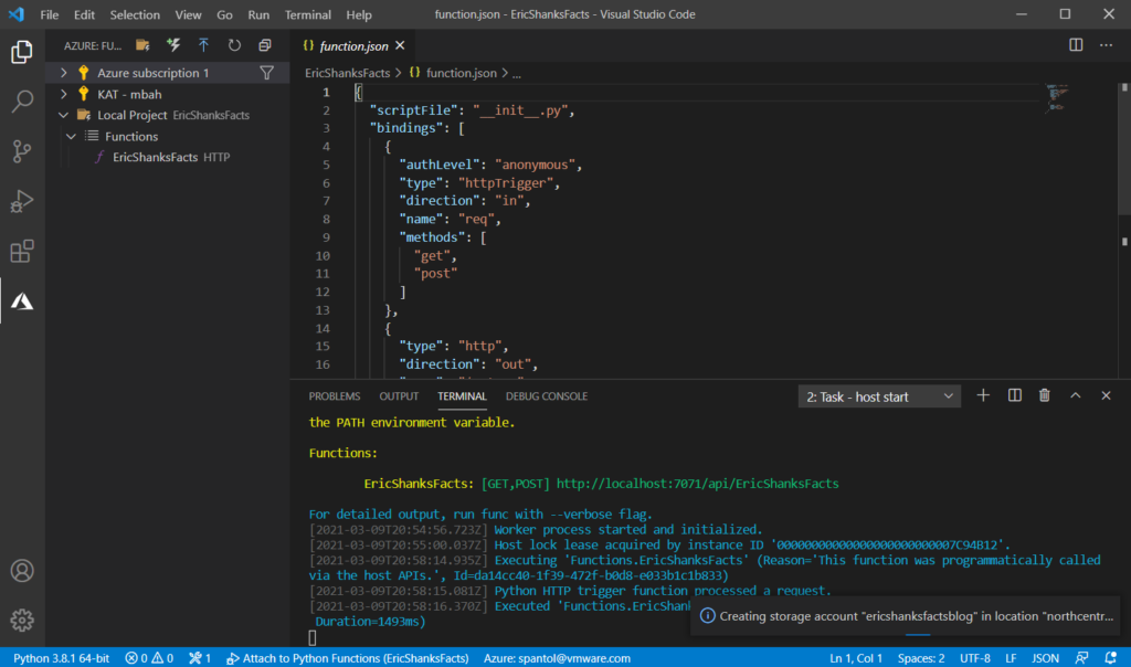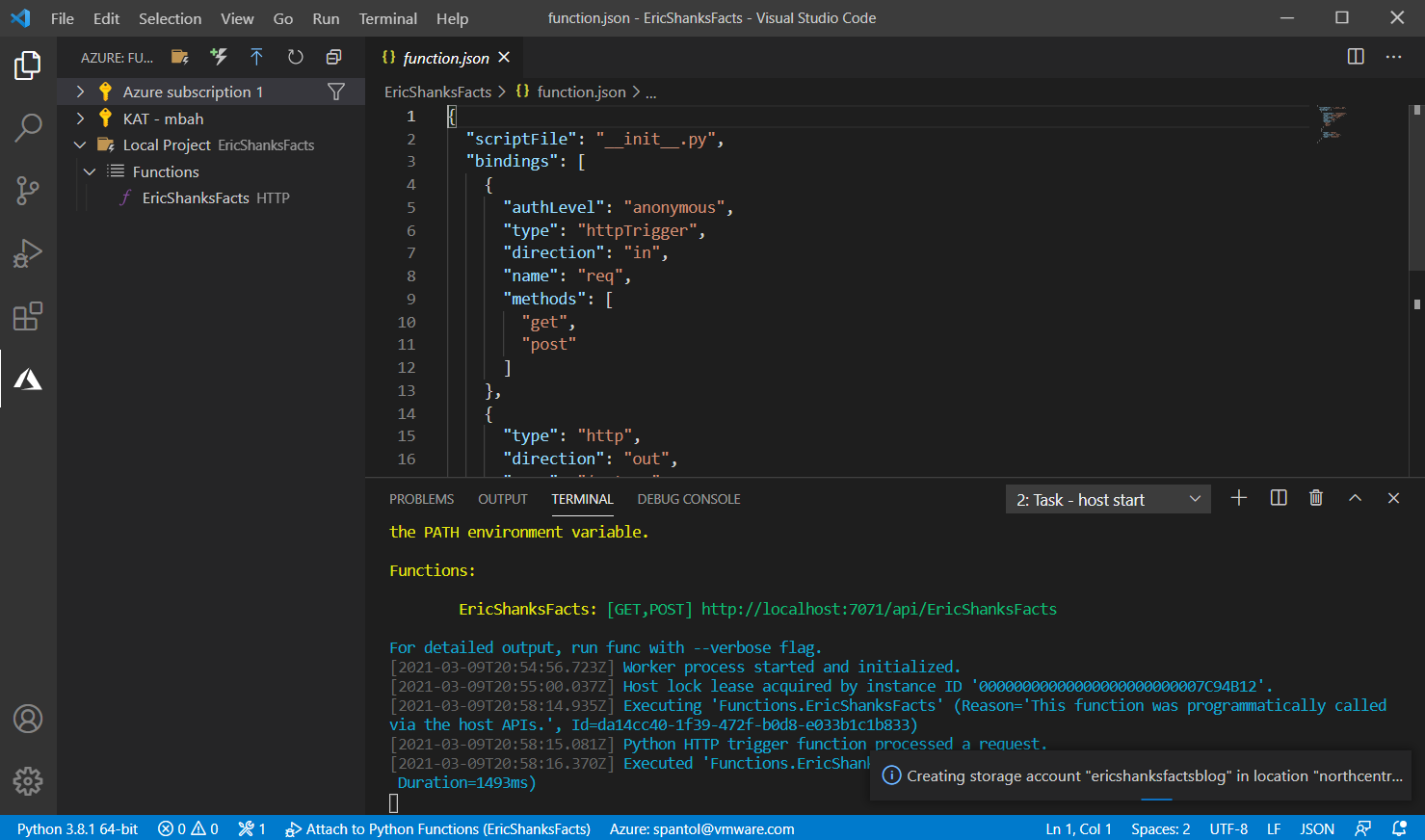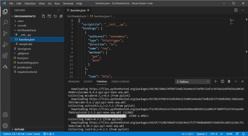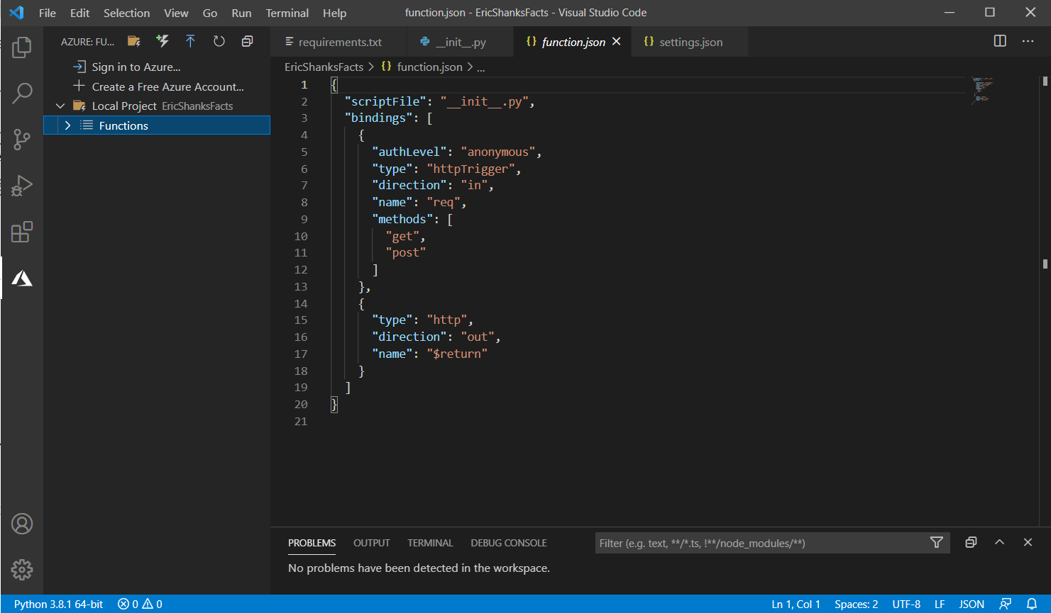 Last time, I did everything with a text editor, a command line Python interpreter, and the AWS Console. This time, I want to use this as an excuse to play with some things that are new(er) to me—Visual Studio Code and Azure Functions.