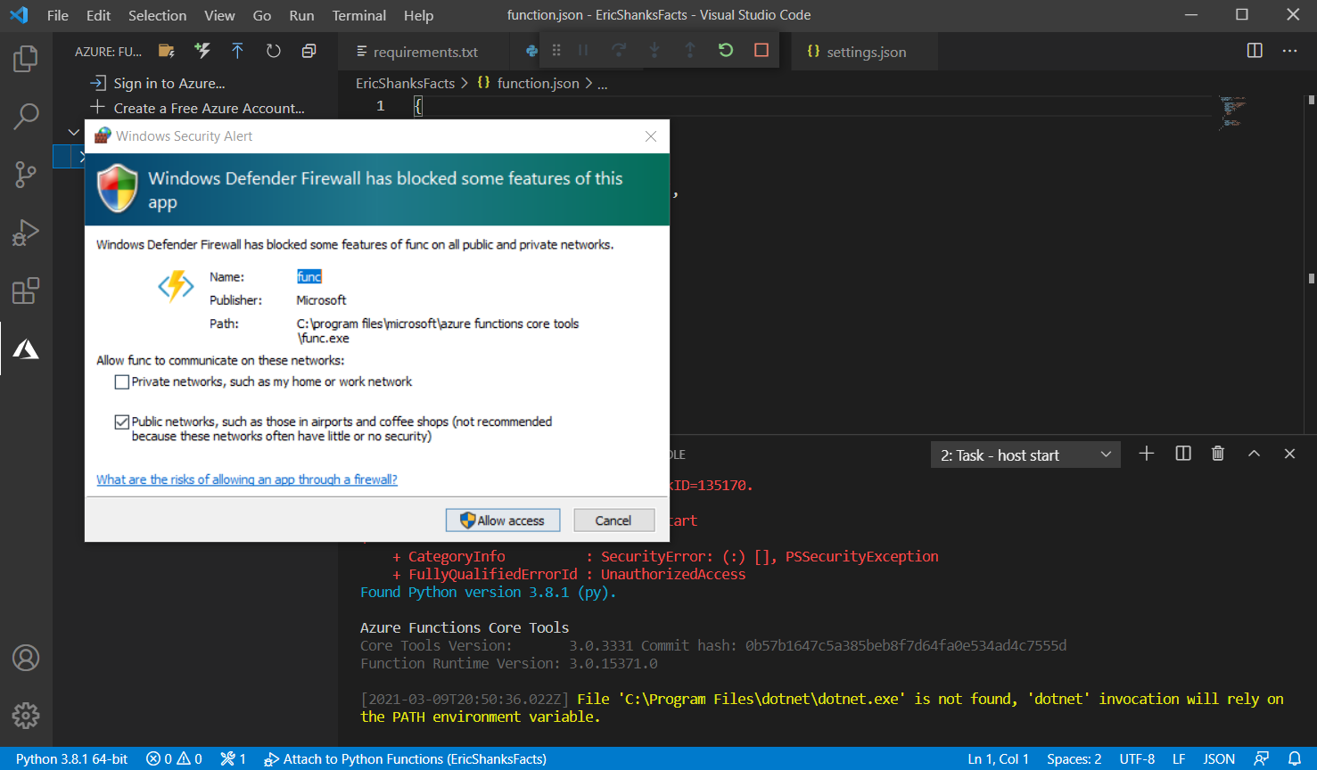 Hit F5 to start the function app project locally. Allow access if prompted: