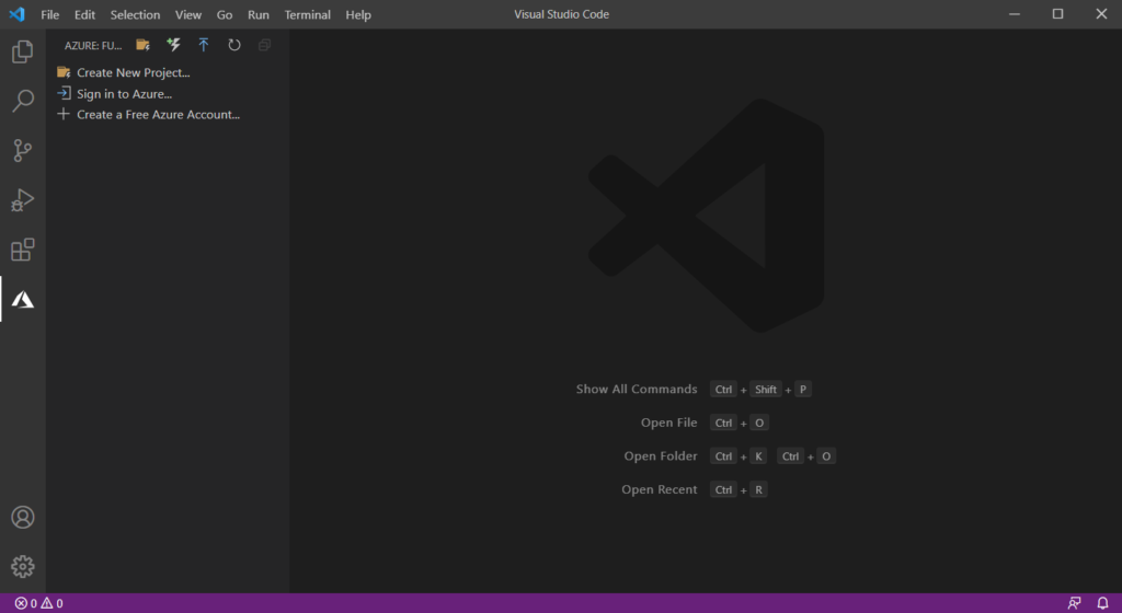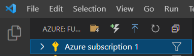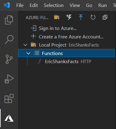 With our extensions ready, we can create our Functions project. Click the Azure icon in the Activity Bar, then in the Azure Functions area click the Create New Project icon, which looks like a folder with a lightning bolt in its lower right.