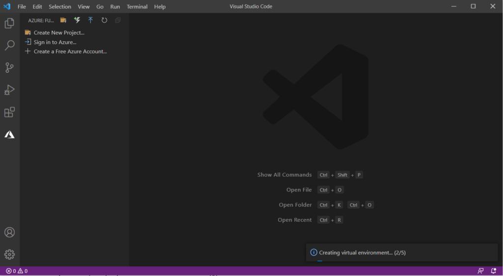 Time will pass while the virtual environment is created. You may get prompted to install a linter, please do so if so.